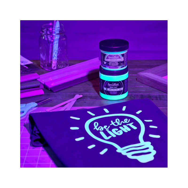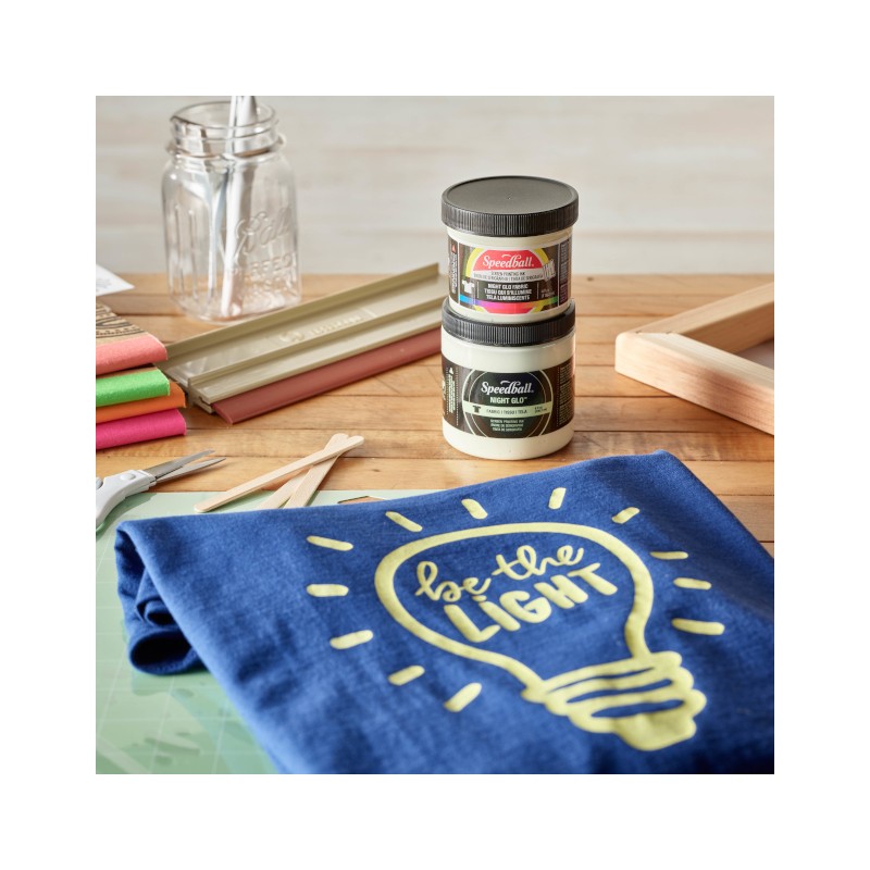 Water-based silkscreen "glow in the dark" ink for printing onto fabric or paper.