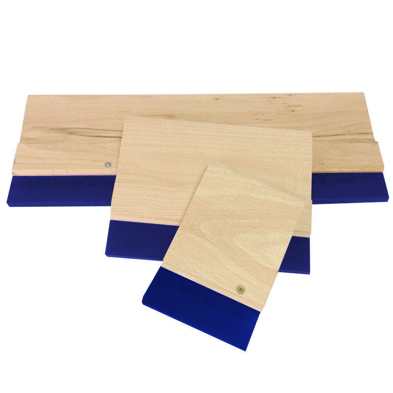Printing squeegee with wooden handle for hand silkscreen printing.