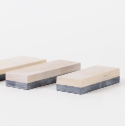 Une pierre à aiguiser Coticule se décline en 2 couches. La couche supérieure présente une épaisseur de 5 à 10 mm, selon la veine (les veines de Coticule n’ont pas toutes la même épaisseur dans notre carrière). Cette couche de Coticule est collée sur un support en schiste noir inutilisable qui sert de base, car le Coticule est un matériau relativement fragile. De minuscules craquelures peuvent être visibles sur les flancs de la pierre. Ce phénomène est absolument normal pour ce type de matériau et n’altère en rien ses propriétés d’aiguisage.