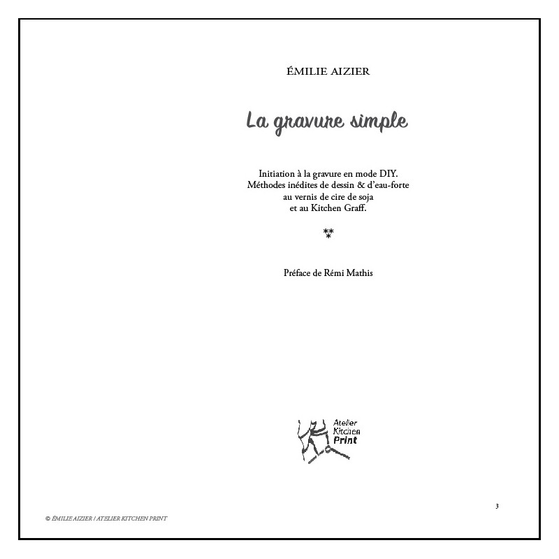 Ce manuel voit enfin le jour après plusieurs années de recherches. Rien n’est absolument arrêté même si l'auteure pense proposer au graveur des alternatives intéressantes pour travailler la gravure le plus agréablement possible, sans odeurs désagréables grâce à la cire de soja pure et sans grand outillage. Vernir sa plaque avec un produit non dérivé du pétrole, c’est possible grâce à la cire de soja, une matière que l'auteure a découverte et dont elle fait part dans le manuel. Et oui aussi, faire de l’aquatinte ou de la manière de lavis simplement (pour petit et moyen format), c’est possible !