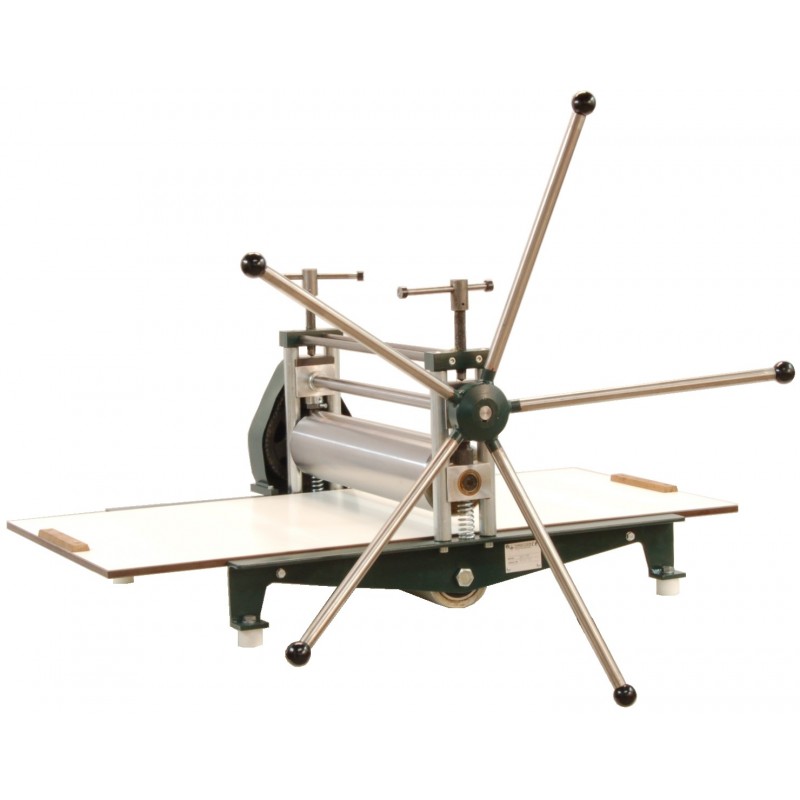 Lors du desserrage des vis de pression, le cylindre supérieur est poussé vers le haut par l'action de deux ressorts. L'espace existant alors entre le cylindre supérieur et le plateau facilite le réglage pour l'impression de gravures sur linoléum ou sur bois.