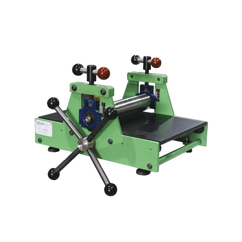 Le diamètre du cylindre supérieur est de 60mm, avec une hauteur maximale depuis le plateau de 20mm. Les paliers des cylindres sont solidaires des vis de pression et montent ou descendent en fonction du réglage. Fonction pratique dans le cas d'impression en relief, xylographie ou linogravure, pour faciliter le réglage de hauteur. Aide supplémentaire, la lecture de la distance plateau/cylindre supérieur se fait à l'aide d'une règle en millimètres.